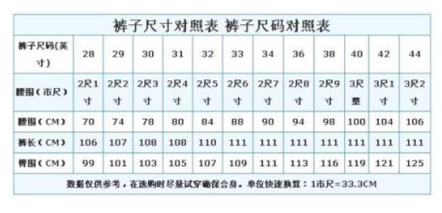 很多品牌还是会在号型制之外再辅以大家都以习惯的标注方法。28是腰围的英寸计法,1英寸约合2.54厘米,所以28英寸腰围就是71厘米。28码的裤子,腰围是2尺1寸, 臀围2尺8左右的,28是英寸,1英寸=2.54cm,英寸-7=市寸,也就是26等于1尺9、27等于2尺,28等于2尺1。