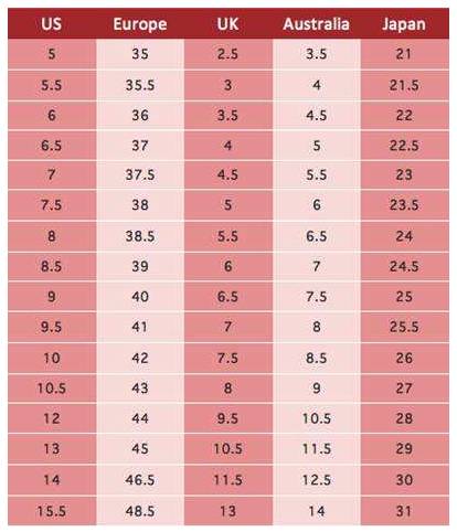 鞋子的尺码又叫鞋号,常见有以下标法:国际、欧洲、美国和英国。