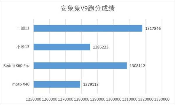 通过对比四款机型的安兔兔跑分成绩可以看到,一加11的得分最高,Redmi K60 Pro次之,小米13和moto X40的表现相差不多,这项测试体现了一加11和Redmi K60 Pro的综合性能表现更为出众。