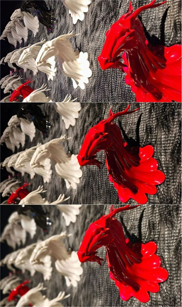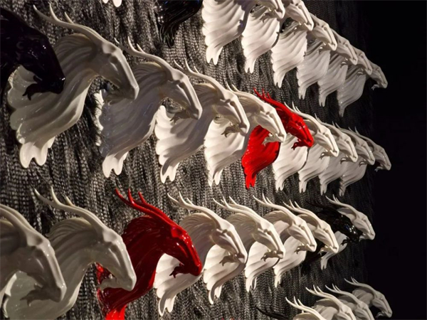 根据展览介绍, “龙代表着中华民族的不屈不挠、勇敢向上、自强不息的精神;马象征速度、坚毅 、忠勇。龙马是态度,传达勇敢坚毅、迎难而上、乐观积极的龙马的精神。”整个展览共有三层楼面,陈列近百件不同材质、不同风格、不同艺术手法创作的“龙马”主题作品,可谓是中西合璧。加上现场还有非常独特的灯光照明,所以整体视觉效果非常有特色。至于展品中,还有两件香港明星 郭富城的书法,也算是相当惊艳了。