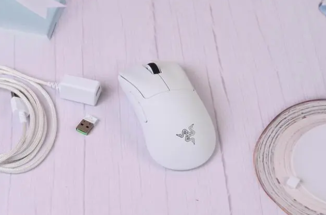 打开雷蛇蝰蛇V3专业版的外包装,映入眼帘的便是鼠标主体。纯白色机身搭配雷蛇logo,颜值颇高。下层则是各种配件,包括最主要的Type-C有线连接线,以及无线接收器。