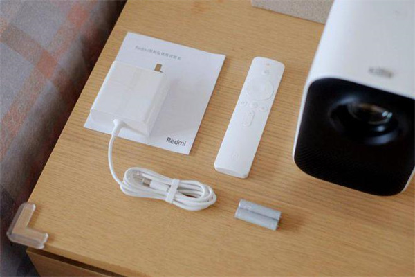 Redmi投影仪外包装非常简约大方,包装里除了投影仪主机外还有一个电源适配器、一本使用说明书,一个白色遥控器及两节7号电池。