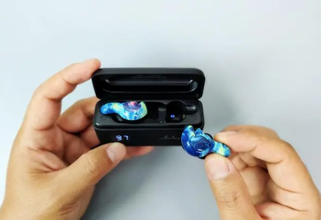这款耳机目前有两个配色,黄蓝飘零的蓝魔、金蓝蔓延的烟火。耳机设计采用了仿生耳蜗形状设计,戴上之后更贴合耳朵轮廓,亲肤材质贴上耳朵之后,比较轻松,平时佩戴一整天都没问题。