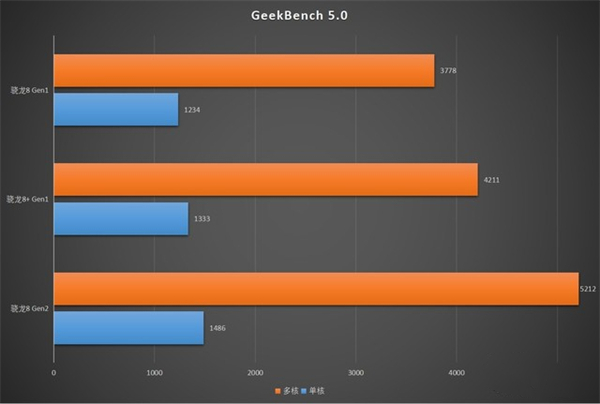 从结果来看,与之前测试过的骁龙8 Gen1机型相比,骁龙8 Gen 2单核提升20%,多核提升38%左右;而与骁龙 8+相比,骁龙8 Gen 2单核提升在11%,多核提升24%。