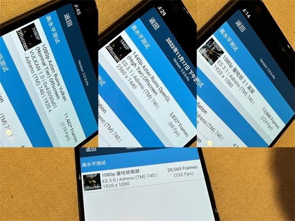 在GFXBench中,GFX-Manhattan 3.0 1080p离屏测试332fps,GFX-Manhattan 3.1 1080p离屏测试224fps,GFX-Aztec ruins 1080p Vulkan离屏测试179fps,GFX-Aztec ruins 1440p OpenGLES3.1离屏测试60fps。