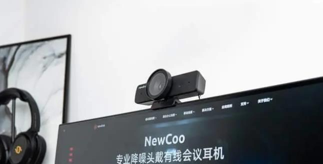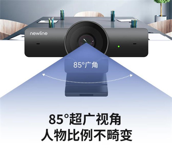 NewEye AI 降噪高清摄像头85°广角,1080P高清画质,支持每秒50帧和60帧刷新频率,另外,摄像头还带有专业背光补偿和自动白平衡算法,可以自动调整光线,让画面保持清晰明亮,而摄像头左边是“newline”英文和拾音孔,右边是状态显示等和拾音孔,镜头还带有一个盖子。