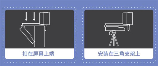 底座不但可以挂在显示器上,还带有一个内螺纹孔,方便用三角支架安装起来使用。