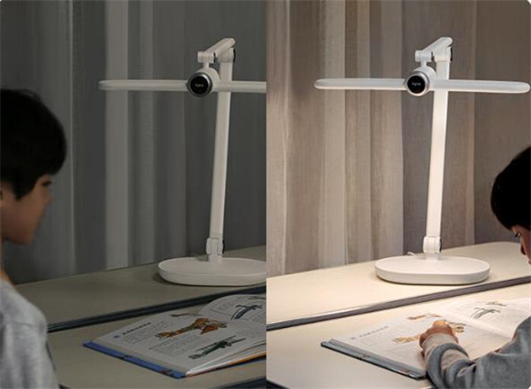 它搭载了高精度的人体感应器和光线传感器,能根据周围 5 米内环境光的变化自动调整光源亮度,支持入座自动亮灯和离座自动熄灭。它的机身采用了五处转轴设计,能自由调节台灯的角度和方位。