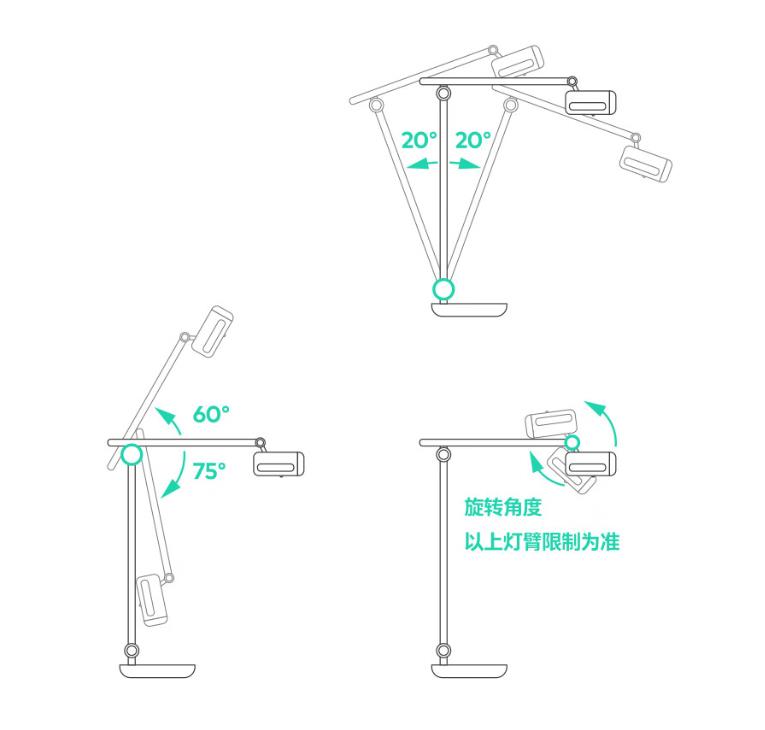 竖轴与横轴之间的转接处,可以实现向上60°向下75°的135°大范围调节。而横轴与灯体的连接处可以210°上下旋转。