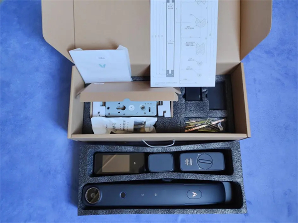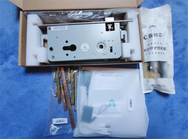 首先,来个简单的开箱,产品包括了前面板、后面板、配件包、锁心包(含机械钥匙2把)、安装开孔图、说明书、锁体1个、IC卡2张、可充电锂电池2块(4200+2000毫安时)。整个门锁亲肤质感,流线设计。即使安装到门上,也是一件艺术品。