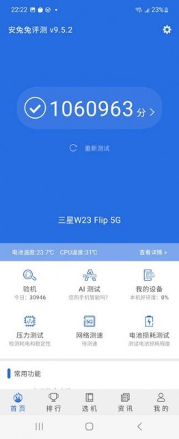 从结果来看,三星W23 Flip的安兔兔跑分为1060963分,在已亮相的骁龙8+旗舰机型中也属于一个非常顶尖的水准,足以应对各种高性能场景的需要。