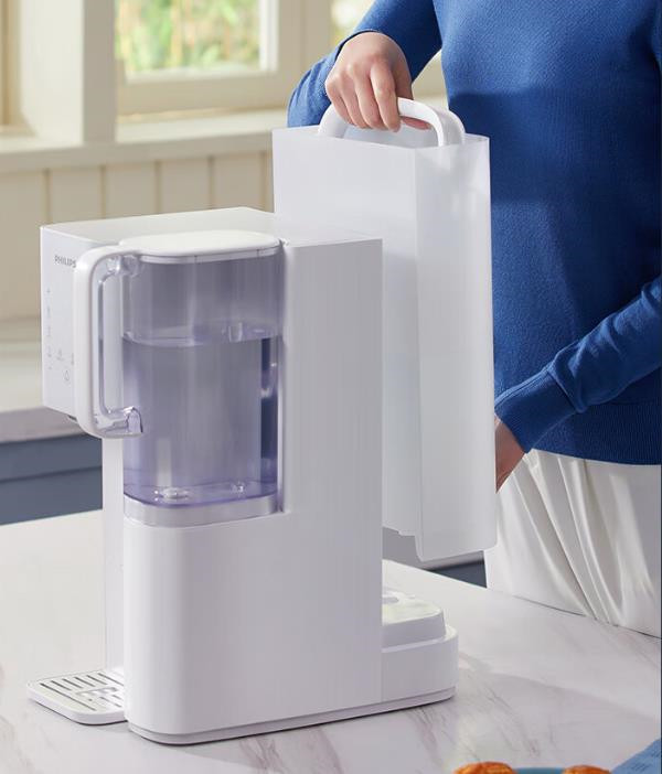 顶部可拆卸顶盖,内置净水滤芯,可更换使用。市面上很多台面饮水器,但能做到净水功能的少之又少,而这次飞利浦做到了,这也是这款产品的一大核心。飞利浦与Aquaporin A/S联合研发,可做到主动过滤,仅允许水分子通过,可滤除110种有害物质,通过充足RO膜结构,长期使用仍可做到净水效果不衰减。