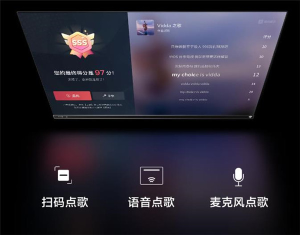 Vidda MUS的音乐、K歌两个栏目在电视的靠前位置,如果需要听歌或者K歌,就会很方便,直接点选对应内容进入就行。当然,如果话筒拿在手,按两下语音键,不管当前电视播放的是什么内容,都可以一键直达K歌界面。手机交互则同样实用,操控上会有一些相比遥控器更大的便利性。而且也不是非得下载App(有的小伙伴可能会抵触吧),直接用微信扫码就可以进入点歌界面了。