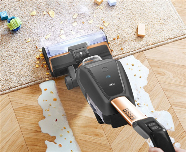 必胜五代DUO洗地机吸力达到9500Pa,清洁率达到99.5%,吸尘模式不用清洁污水箱,当吸尘器用可以一周倒一次垃圾。5.0续航30分钟以上,滚刷左右贴边设计,清洁无死角,每分钟擦地2000次强劲清洁,不论是地面清洁污水、蛋液、酱醋等都会即拖即干,不留水渍,清洁重油污也没有问题,它可以添加45~60℃热水,用来溶解清洁油污,高效清洁。干湿垃圾是分开拦截的,污水箱有拦截过滤网,可以拦截微尘、毛絮头发,大颗粒垃圾,毛发不会缠绕到滤网上,处理时好清洁。