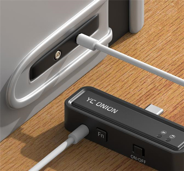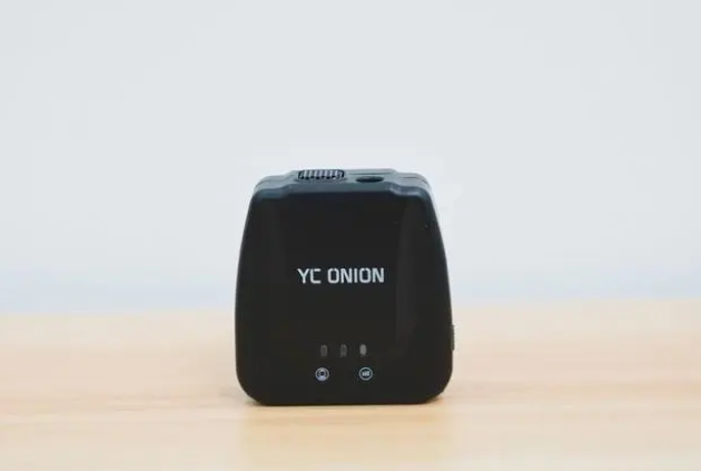 收纳盒内部空间布局合理,能够看到最少可以容纳两个TX发射器和一个RX接收器,将两个产品放进收纳盒就能充电。收纳盒的外形也很好看,正面有YC ONION的logo,同时还有一个电量指示灯,侧面有一个Type-C充电接口。