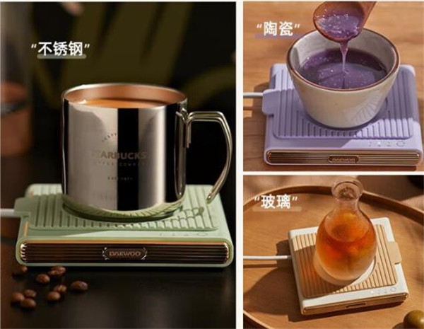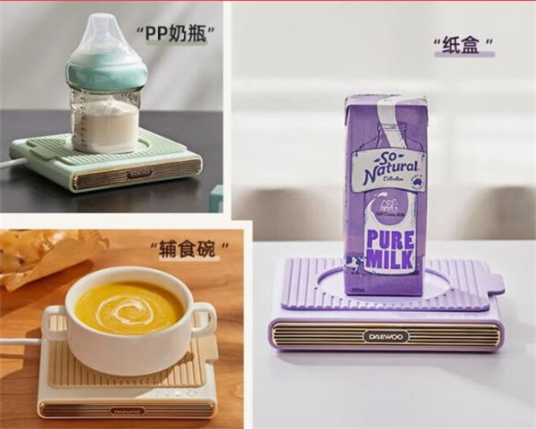 大宇暖暖垫2.0可以适配更多材质的器具,陶瓷、玻璃、不锈钢,纸杯、PP奶瓶、辅食碗,想暖都能暖、百搭不挑杯!