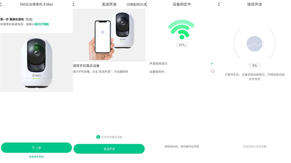 给8 Max找个适合的地方放置好通电,然后在手机端下载并安装360智慧生活APP,选择对应监控机型,输入Wi-Fi密码后通过声波配对即可。
