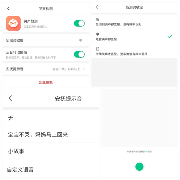 安抚音包括文字、小故事、甚至自主录制一段15s内的语音。由于都是本地AI芯片进行处理,因此所有监护行为精准且快速。