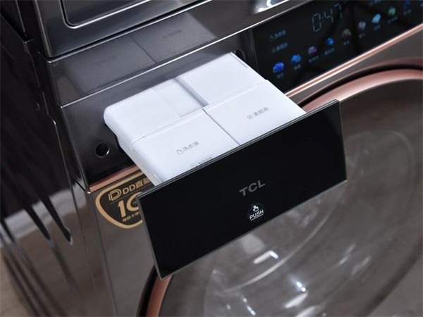 针对不同的衣物量,很难选择正确或合适的洗涤剂使用量,一旦过量投放,多余的油性洗涤剂就会附着在内筒外壁,并吸附滋生大量细菌。为了解决这一痛点,TCL 给出的解决方案很巧妙,那就是智能投放,把洗涤剂投放这件事交给自动化的程序。
