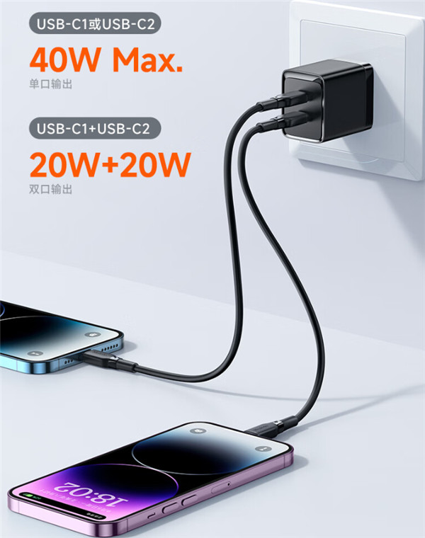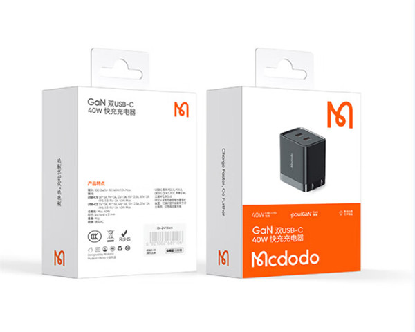充电器充电过程或多或少都会有发热的情况,麦多多氮化镓双C 40W快充充电器内部有智能温控和高效能散热结构,热量传导快,即便是40W满载运行,也能使充电器维持一个比较低的温度。