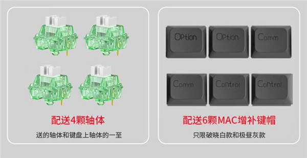 针对Mac用户,黑爵AK873还额外配备了相应的增补键帽,方便用户自行更换使用,windows/mac双系统尽情畅玩。