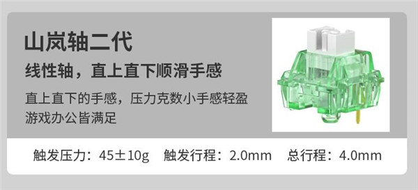 黑爵AK873采用了二代山岚轴,它的触发压力为45±10g、2mm触发行程、总行程4mm,整体呈现出直上直下的手感,而较小的压力克数,以及更为安静的表现,非常适合办公室日常使用。当然,拿来游戏的话,也会有不错的体验。