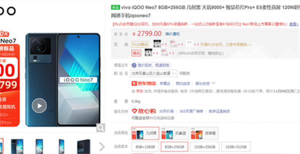 iQOO Neo7 8+128版本售价2699元,不过更推荐8+256的版本,双十一期间优惠200元,到手为2799元,只贵了100元但是却有着更大的存储空间。