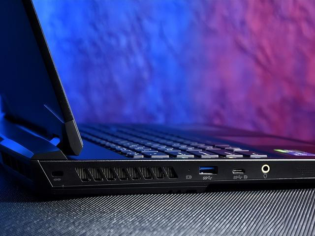 机身左侧配有安全锁孔,1个USB-A 3.2 Gen 2,1个USB-C 3.2 Gen 2(支持DP1.4),另外还配有1个3.5mm耳麦音频插孔。