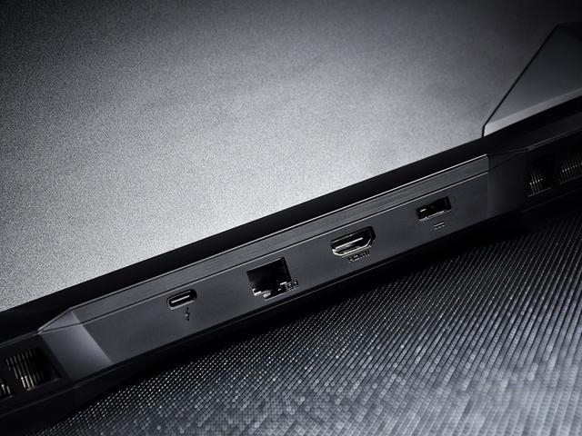 机身尾部配有1个雷电4,1个RJ45以太网口,1个HDMI接口(支持8K@60Hz/4K@120Hz),以及微星游戏本特制的电源接口。