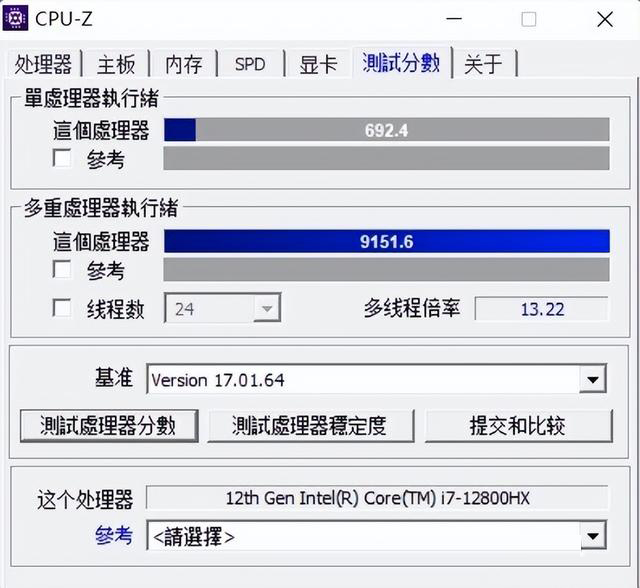 首先我们看看CPU-Z测试,实测其单核性能评分692.4,多核性能评分9151.6,从测试结果来看,微星冲锋坦克Pro GP76 HX相当完美地发挥出了这颗处理器的单核和多核性能,说明这款产品的性能调校极为出色。