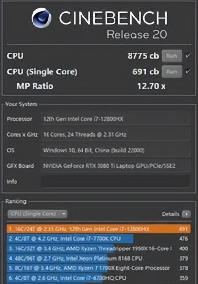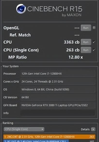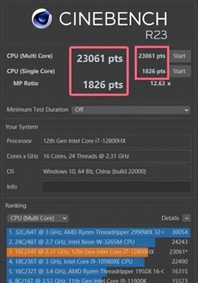 CINEBENCH测试标准中,实测CINEBENCH R15多核3363cb、单核263cb;CINEBENCH R20多核8775cb、单核691cb;CINEBENCH R23多核23061pts、单核1826pts。无论是多核还是单核,这颗处理器事实上已经超过了12代酷睿i9-12900HK性能。尤其是多核性能表现极为出色。