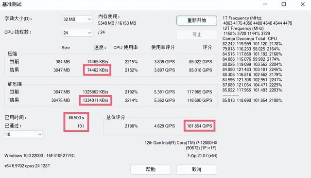 压缩与解压缩在日常办公应用中会频繁涉及,不只是打包与解包,几乎所有软件后台运行都会做压缩与解压缩的工作。通过7-Zip测试可以看到,完成10轮测试耗时86.5秒,压缩速度达到74462KB/s,解压缩速度达到1334011KB/s,总体评分为101.854GIPS,压缩与解压缩性能优异。
