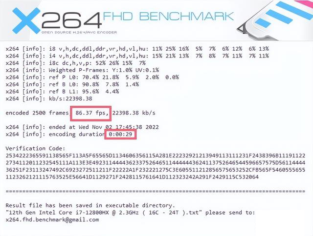 X264 Benchmark测试标准下,完成2500 frames编码耗时仅29秒,帧率高达86.37fps,编码效率不错,满足极重负载H.264视频编码任务没有任何压力。