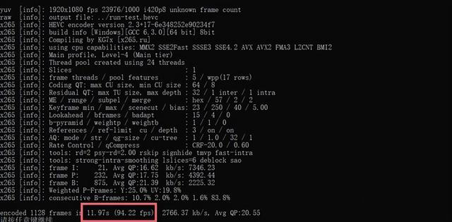 H.265编码测试中,完成1128 frames用时仅11.97秒,帧数高达94.22fps,同样表现极佳。从编码性能测试可以看出,12代酷睿i7-12800HX核心增加、缓存增大,对于编码效率提升可谓是立竿见影,所以微星冲锋坦克Pro GP76 HX即便作为核心生产力工具来使用,也是绝佳选择。