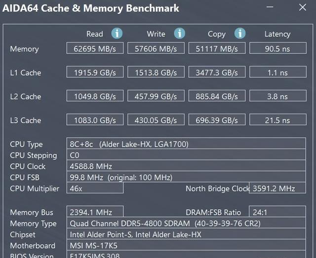 冲锋坦克Pro GP76 HX搭载了16GB DDR5内存,实测读取速度达到62695MB/s,写入速度57606MB/s,拷贝速度51117MB/s,延迟90.5ns。相对于DDR4内存,读取、写入速度提升超过50%,拷贝速度提升超过60%,虽然延迟略高于DDR4内存,但读写性能带来的整体性能提升收益更大。同时,冲锋坦克Pro GP76 HX内存的延迟相对于一般的DDR5内存机型100多ns的延迟而言要低一些。