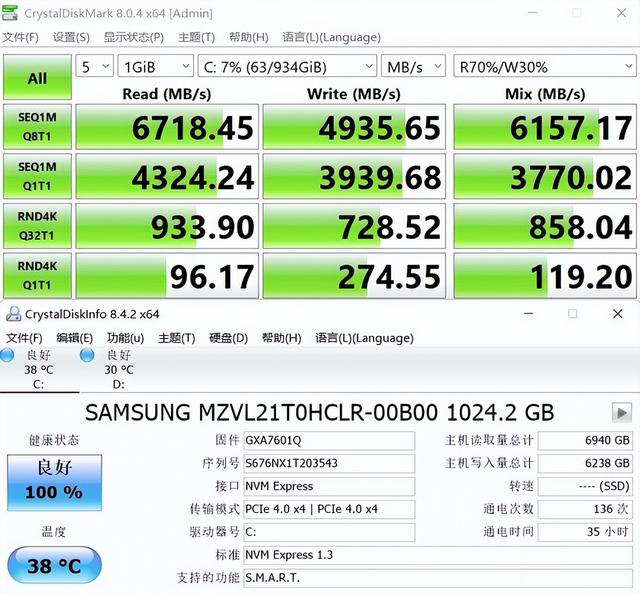 硬盘存储方面,这款机器配置了一块1TB容量三星PCIe 4.0固态硬盘,实测其读取速度6718.45MB/s,写入速度4935.65MB/s,4K随机读取速度为96.17MB/s,写入速度为274.55MB/s,从测试来看,这块固态硬盘的性能水准处于PCIe 4.0固态硬盘的高端水准,尤其是4K读写速度非常出色。