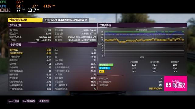 最高画质,2.5K分辨率平均帧率高达85fps,游玩体验非常爽快。配合240Hz高刷屏,竞速类有游戏的体验就是“丝滑”。