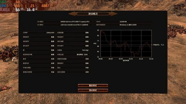 在最高画质、2.5K分辨率下,冲锋坦克Pro GP76 HX运行这款游戏的平均帧数可以达到71.1fps,流畅度相当满意。