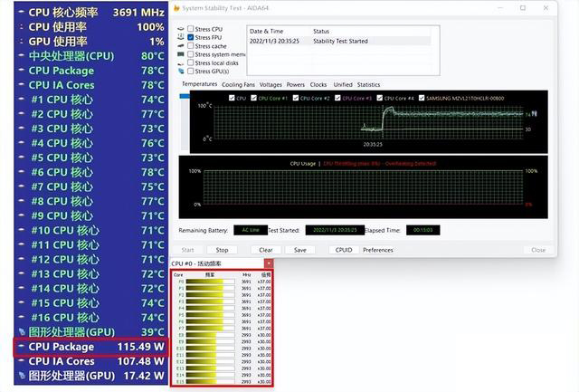 首先在AIDA 64 Stress FPU压力测试下,处理器16个核心温度在71℃-78℃之间,功耗稳定在115.49W,P-Core频率稳定在3.7GHz,E-Core频率稳定在3.0GHz。115.5W功耗能够控制在80℃以内,而且频率保持3.7GHz,这样的表现可以用“恐怖”来形容。