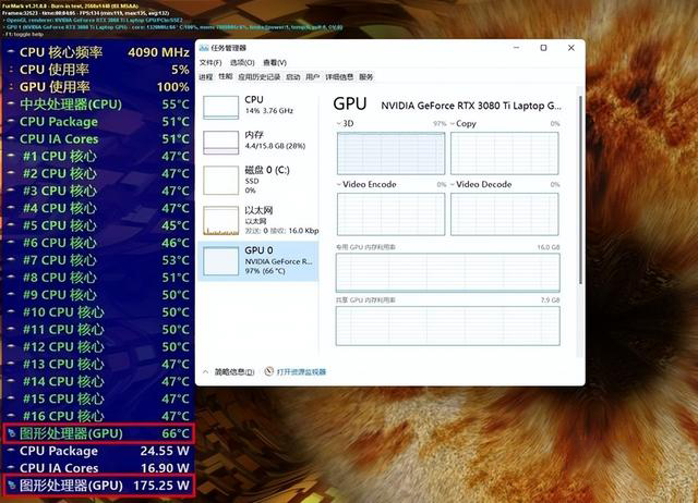 接下来是Furmark的GPU单烤机测试,2.5K分辨率下,GPU功耗释放175.25W,达到了175W RTX 3080 Ti功耗释放最佳状态,同时可以看到,此时GPU温度仅为66℃,功耗与散热表现极佳。