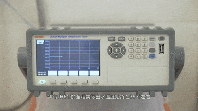 开启宝宝浴后,我们同时用温度测试仪持续记录其连续10分钟的出水温度,经过测试可以看到,华帝JH61i的全程实际出水温度始终在39℃左右,温差控制在0.5℃以内,可见其温度控制精确。
