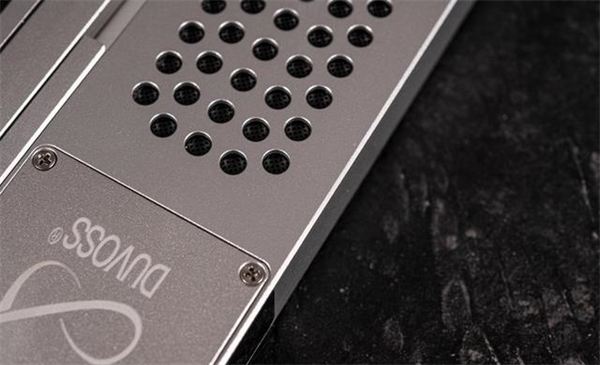 支架的底面,左右分布着两个发声单元,发声孔采用了CNC工艺镂刻而成,上方还印有DUVOSS的品牌logo。