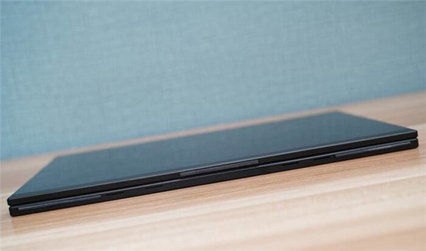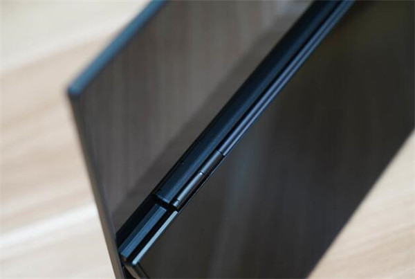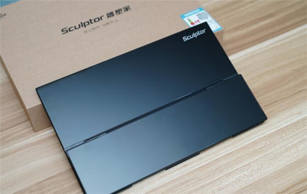 显示器背面采用了亮面烤漆处理,让整体多了一丝高级感,右上角是雕塑家的LOGO。航空铝合金中框材质轻质又坚固,它的尺寸为298x205x4mm,折叠底座厚12.8mm,重量约为780g,轻薄又便携,和13.3寸的笔记本装在一个包里,也十分方便,走到哪用到哪。