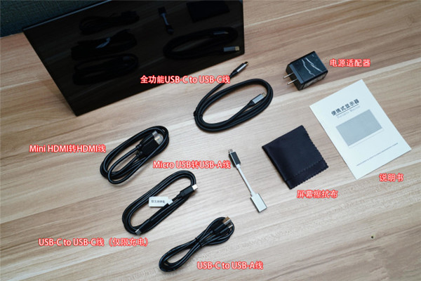 官方提供了说明书、电源适配器、屏幕擦拭布、全功能USB-C to USB线、Mini HDMI转HDMI线、Micro USB转USB-A线、USB-C to USB-A线、USB-C to USB-C电源线,方便大家连接手机、游戏机、PC、笔记本电脑、掌机等硬件。
