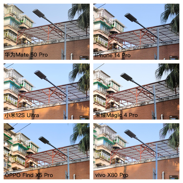 从画质来看,六款机型的长焦镜头成像差异有些明显,小米、华为、荣耀的选手由于拥有超高像素的潜望式镜头,对付这种场景简直信手拈来,画质和解析力完全不输主摄。但vivo、OPPO以及苹果的表现就稍差一些了,虽然可用,但画质和“顶级”仍有差距。