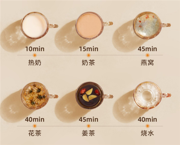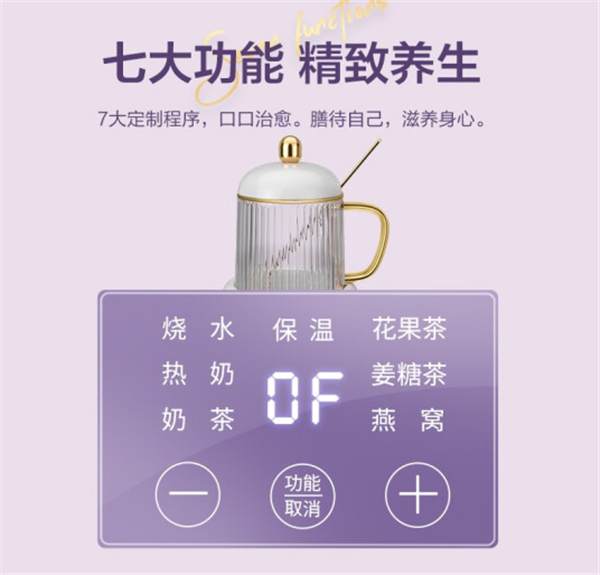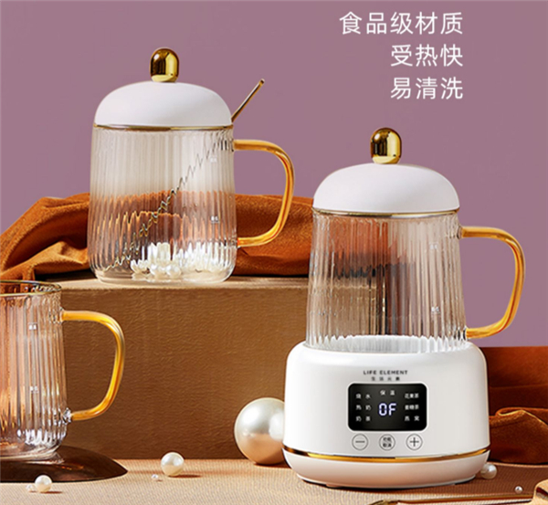 生活元素Mini分离式养生杯支持多种模式可调,包括烧水、热奶、奶茶、花果茶、姜糖茶、燕窝。无论是40度的蜂蜜水,还是80度的花茶,都可以根据食材的不同,订制不同的炖热时间。