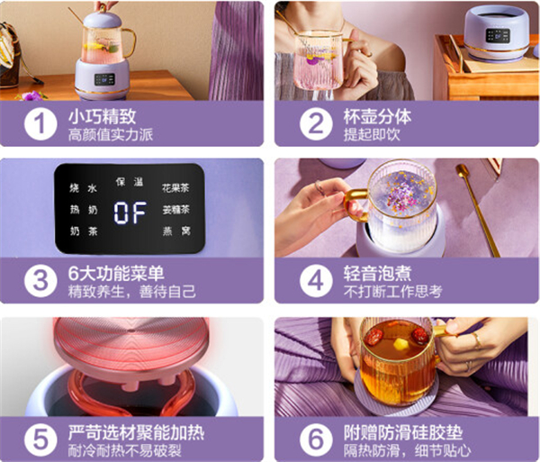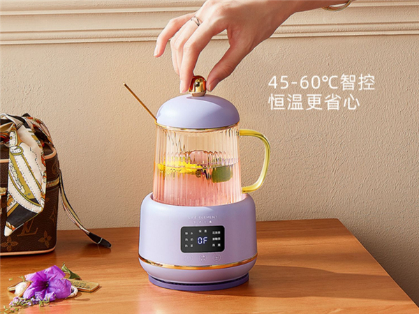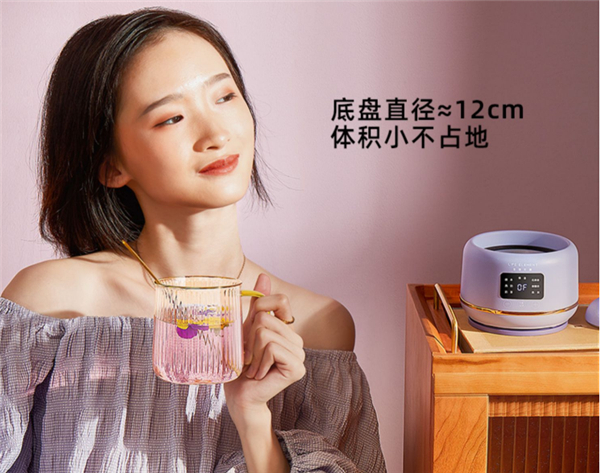 生活元素Mini分离式养生杯底座和杯盖的表面是磨砂工艺,摸起来的触感很细腻,有白月光、香芋紫两种颜色可选。分体式杯体设计,体积非常小巧。放在办公桌或者学习桌上不会占据太大的地方,不影响正常的工作和学习。