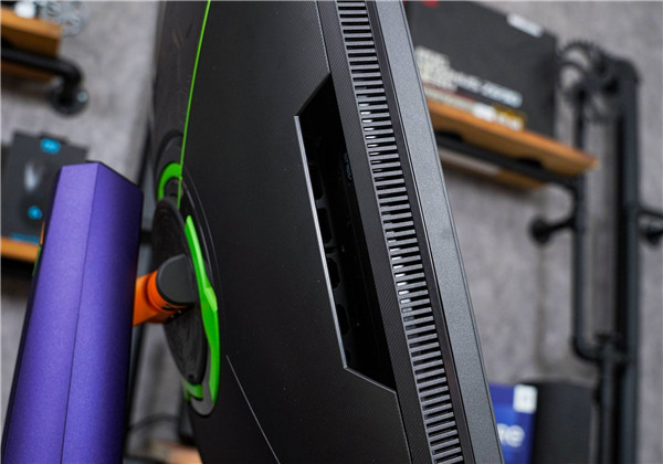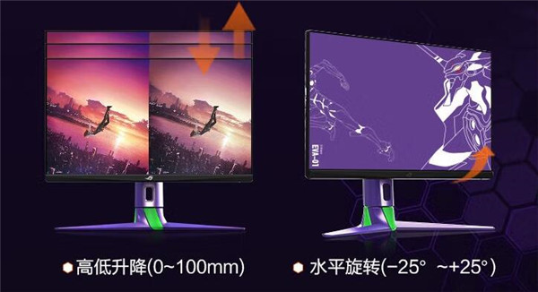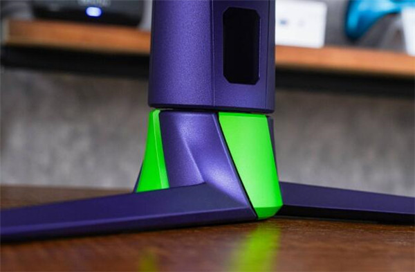 显示器背部以初号机核心铠甲造型为灵感来源设计了旋转铠甲支架环,搭配上经典的“一刀流”绿色斜切纹路设计,满满的机甲风跃然而上。