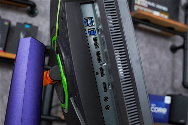 显示器下方接口处旁边采用了挡板隐藏式的设计,从左到右分别是电源、耳机、HDMI、DP、USB-B、USB-A。DP 1.4接口*2, HDMI 2.0*2,要满足带宽的话直接上DP接口,毕竟270Hz刷新还是需要高带宽来支持的。