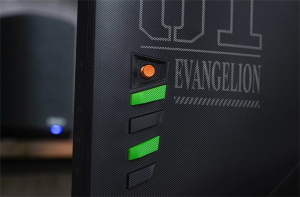 在小细节上也不放过初号机的概念,显示器的控制键就是其中之一,上面是硕大的“01”喷涂标识,而显示器按键则设计成摇杆形式+按键组合,这个比单纯的按键的操作更方便。